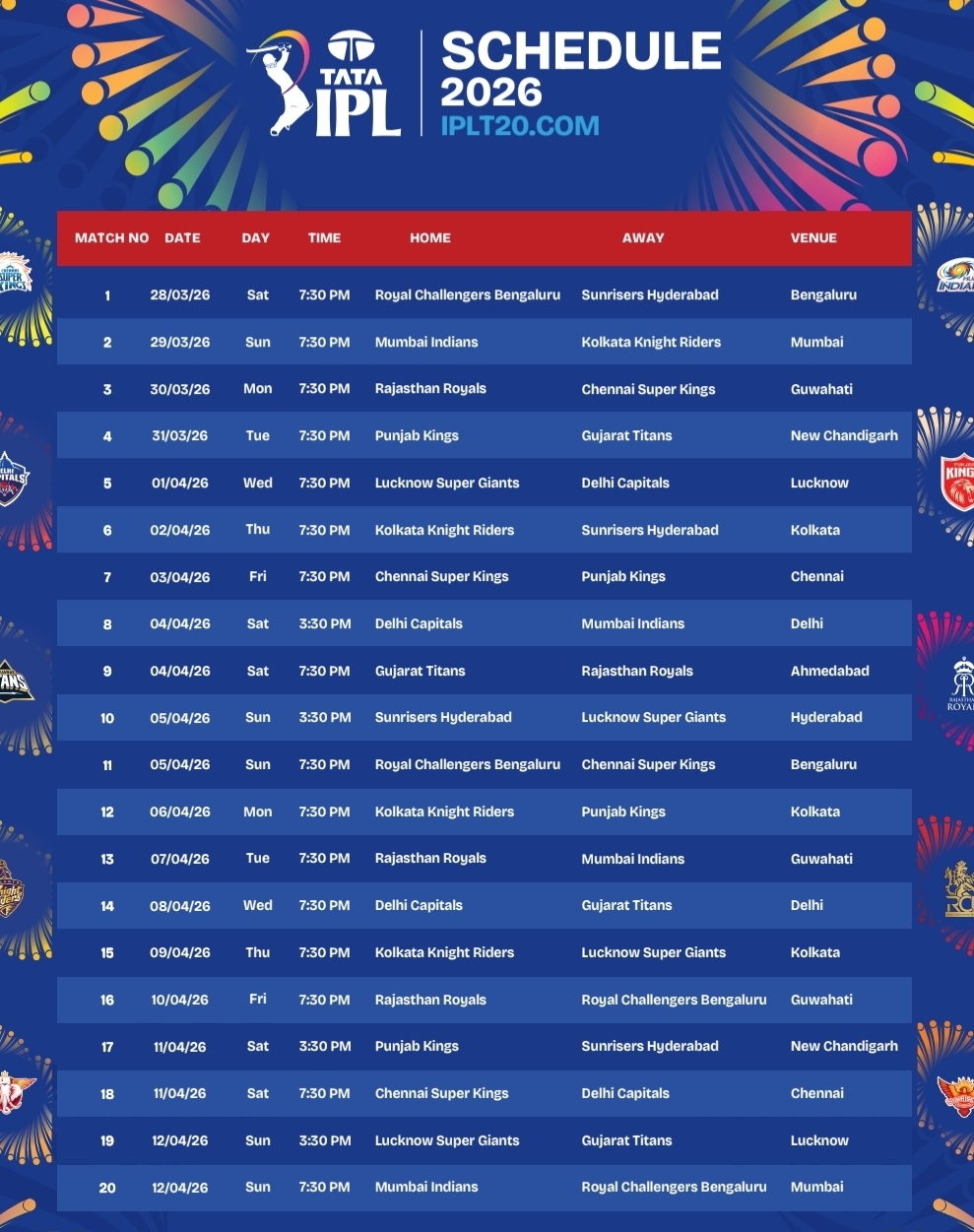 During the season, Royal Challengers Bengaluru will play five home matches in Bengaluru and two in Raipur. Punjab Kings will play four home matches in New Chandigarh and three in Dharamshala, while Rajasthan Royals will play three home matches in Guwahati and four in Jaipur.Note: The matches scheduled in Bengaluru are subject to clearance from the Expert Committee constituted by the Government of Karnataka. The committee will conduct a meeting and inspection of the M. Chinnaswamy Stadium on March 13, 2026, during which a full-scale mock demonstration of match-day arrangements will be carried out to assess the stadium’s preparedness for hosting IPL matches.