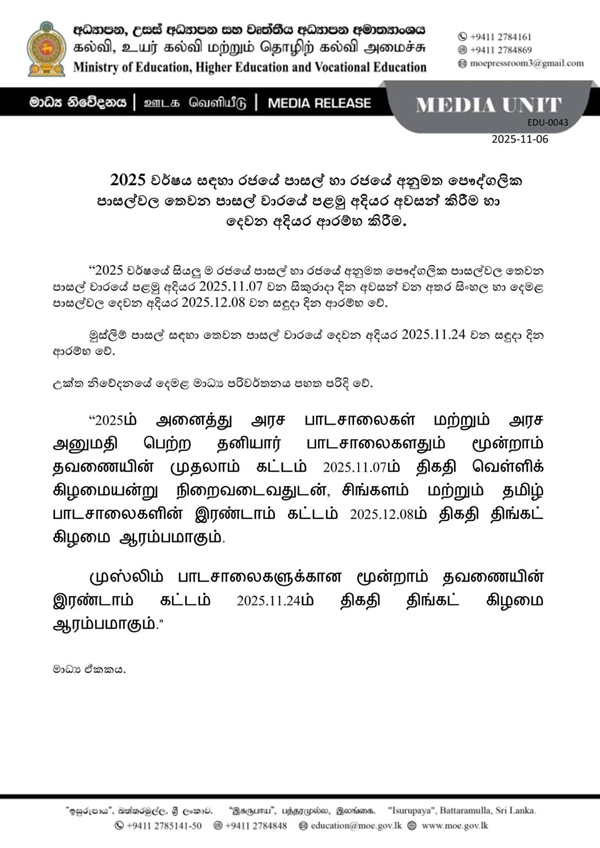 The second phase of the third term will commence on Monday, December 8, 2025, for Sinhala and Tamil schools.