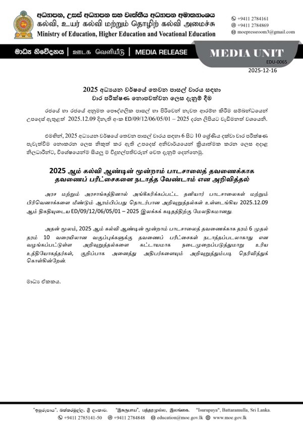 The Ministry of Education has announced that term examinations will not be held for Grades 6 to 10 during the third school term of the 2025 academic year.
