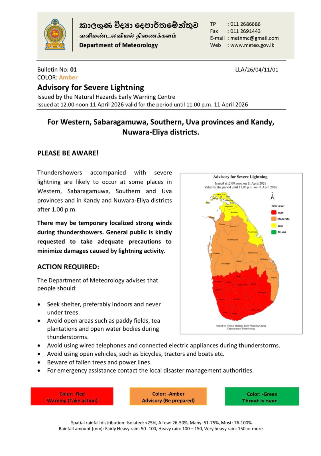 The Department of Meteorology has issued an advisory warning of severe lightning activity across several parts of Sri Lanka, including the Western, Sabaragamuwa, Southern and Uva provinces, as well as the districts of Kandy and Nuwara Eliya.