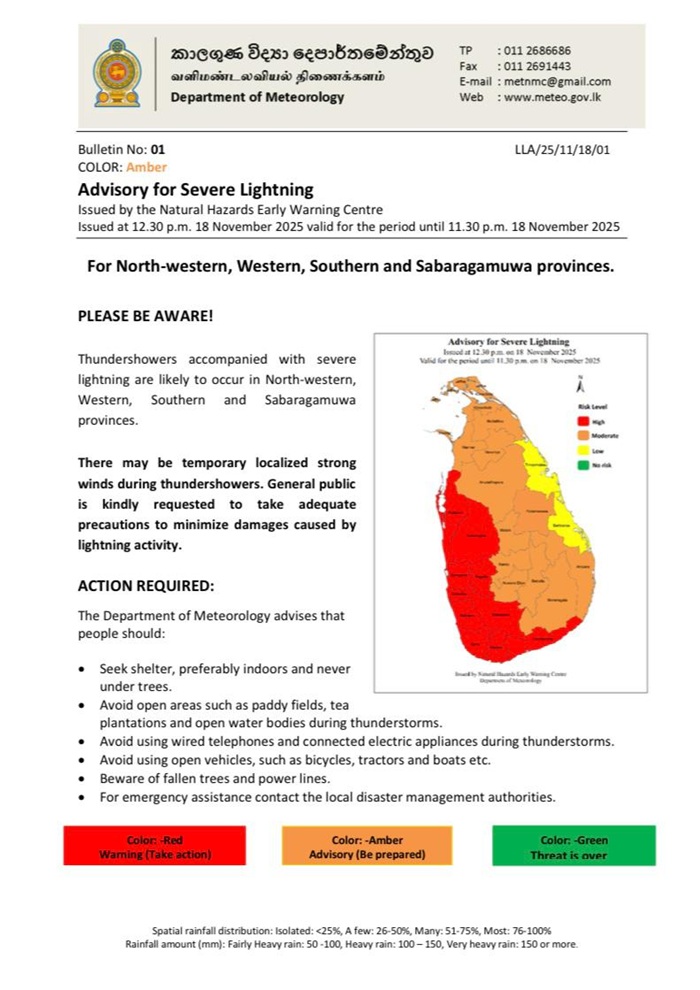 The Department of Meteorology has issued an advisory for severe lightning in the North-western, Western, Southern and Sabaragamuwa provinces today.
