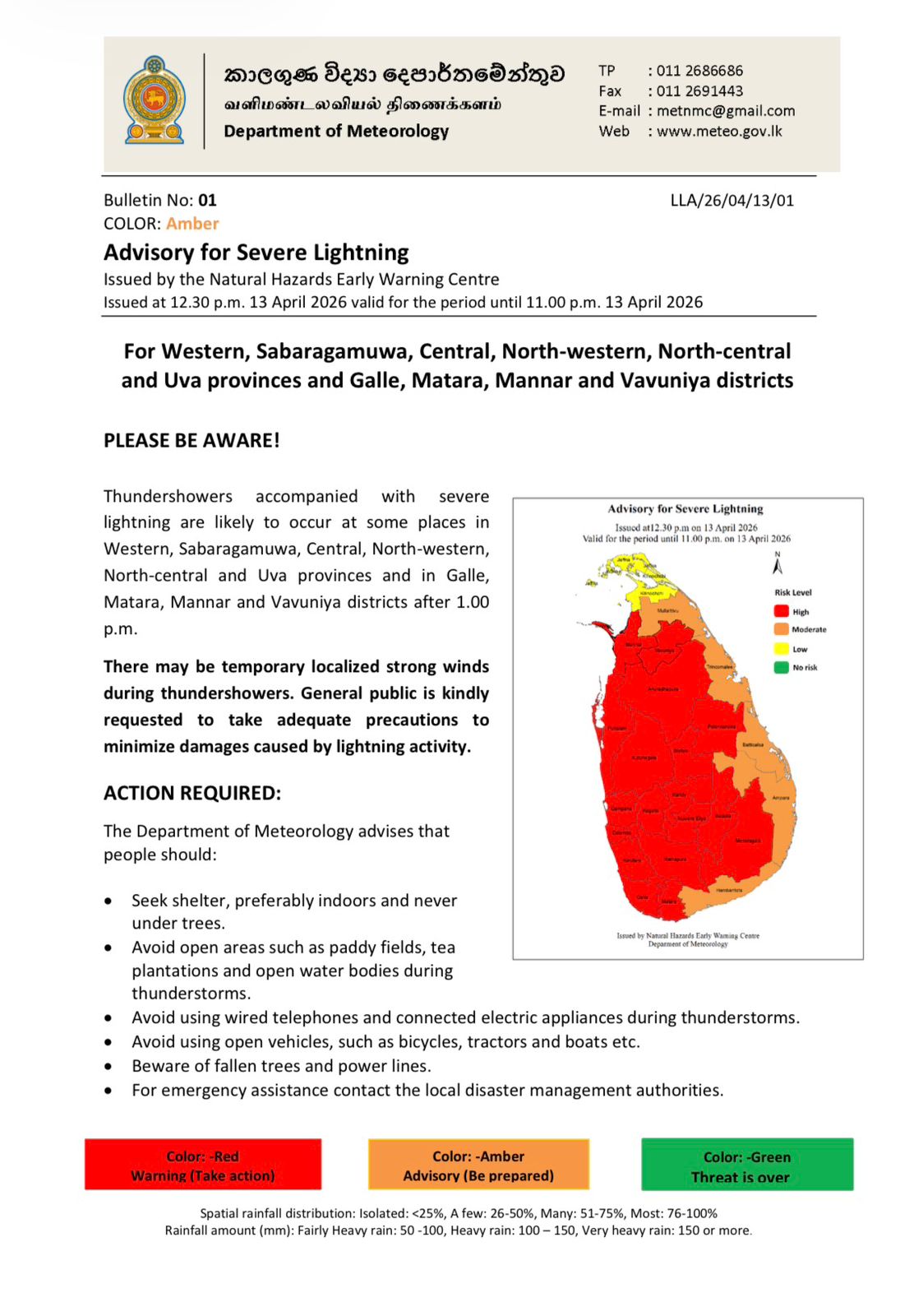 The Department of Meteorology has issued a severe lightning advisory for multiple parts of the country, valid from 12.30 p.m. to 11.00 p.m. today (April 13).