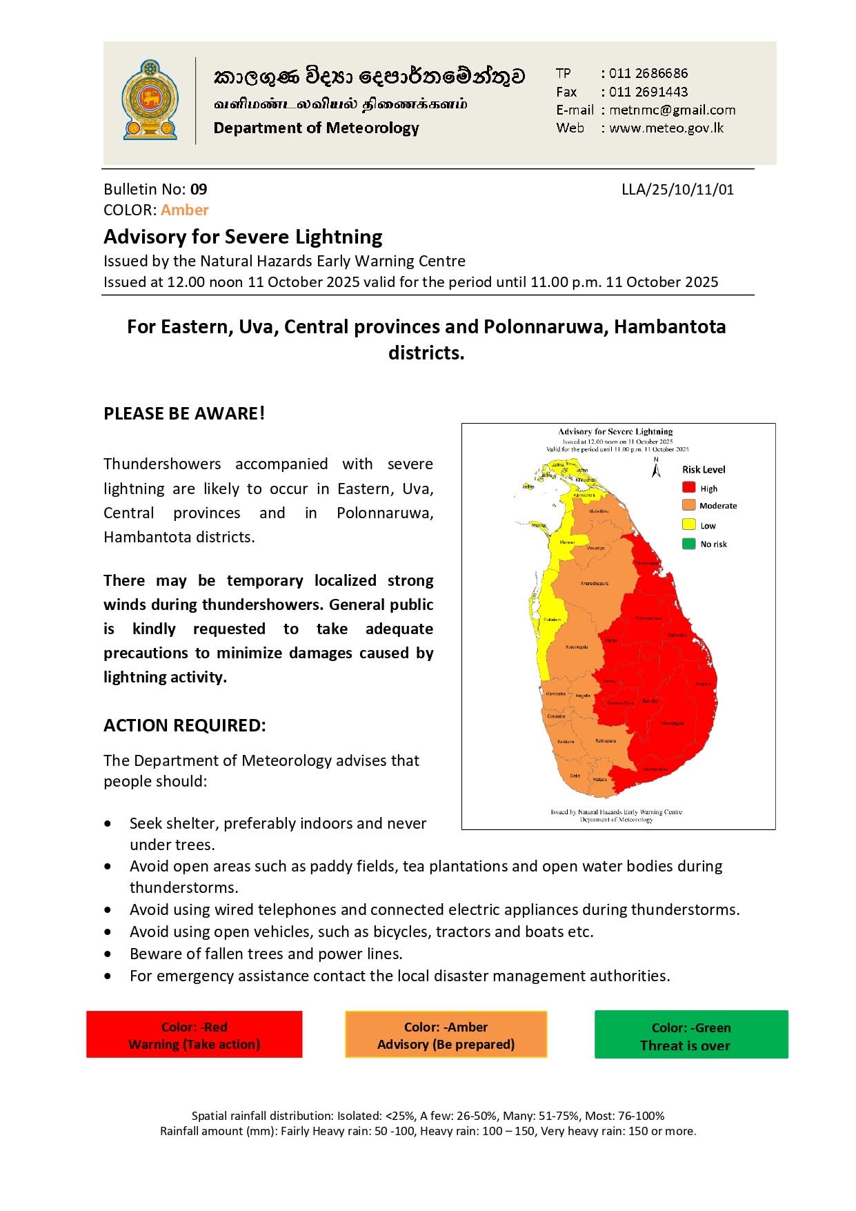 Severe lightning and thundershowers are expected in the Eastern, Uva, and Central provinces, as well as in Polonnaruwa and Hambantota districts until 11:00 p.m. on 11 October 2025, the Department of Meteorology has warned.