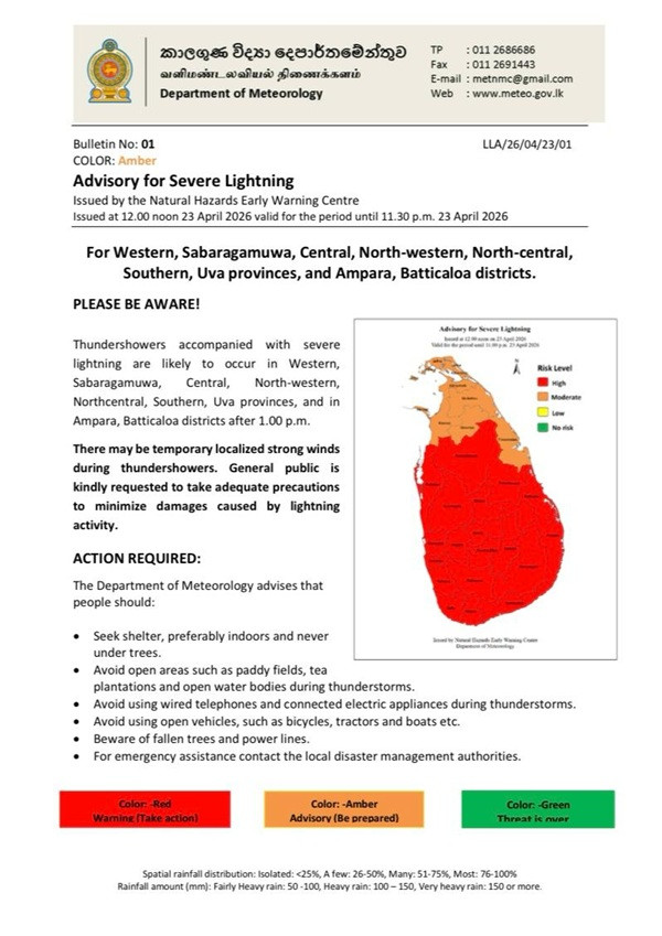 The Department of Meteorology has issued an advisory for severe lightning in the Western, Sabaragamuwa, Central, North-western, North-central, Southern, Uva provinces, and Ampara and Batticaloa districts today (23).