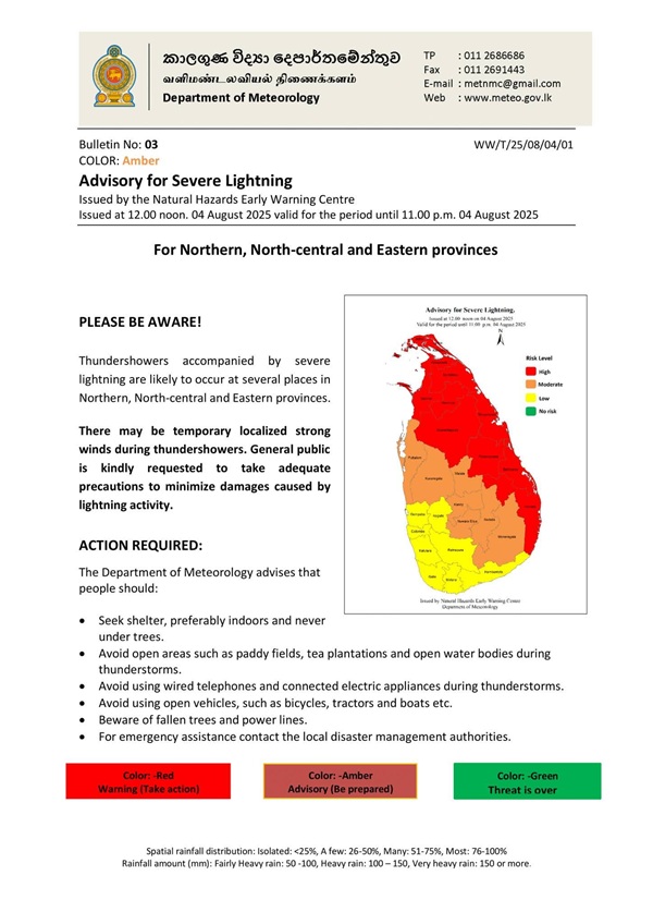 The Department of Meteorology has issued an advisory for severe lightning for the Northern, North-central and Eastern provinces, effective until 11.00 pm today.