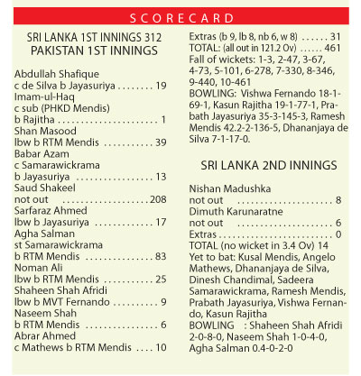 Earlier the day started with one hour delay due to rain and wet ground conditions and over night batters Saud Shakeel and Agha Salman resumed their innings to build up the total. The pair added superb 177 runs sixth wicket stand. Salman was first to out scoring 83 in 113 balls with 9 fours and a six while off spinner Ramesh Mendis struck to get Salman and wicket keeper Sadeera Samarawickrama made a smart stump in the 56th over of the innings.