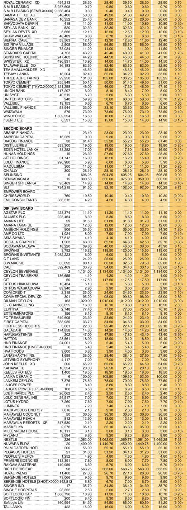 Shares – Colombo Stock Exchange ( Market Statistics on 06.04.2023 ) Business On Apr 6, 2023 Untitled 46 0 47 Share Business Tags: Print Edition Shares – Colombo Stock Exchange Friday, April 7, 2023 – 01:00 0 47 Share FacebookTwitterGoogle+ReddItWhatsAppPinterestEmail