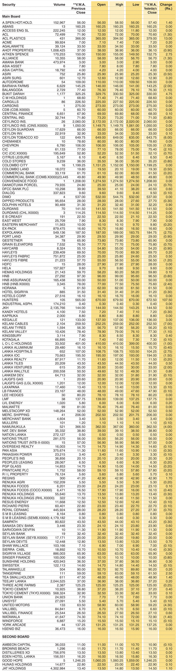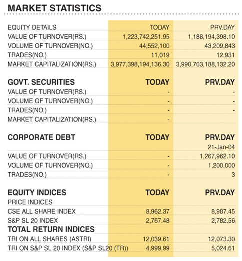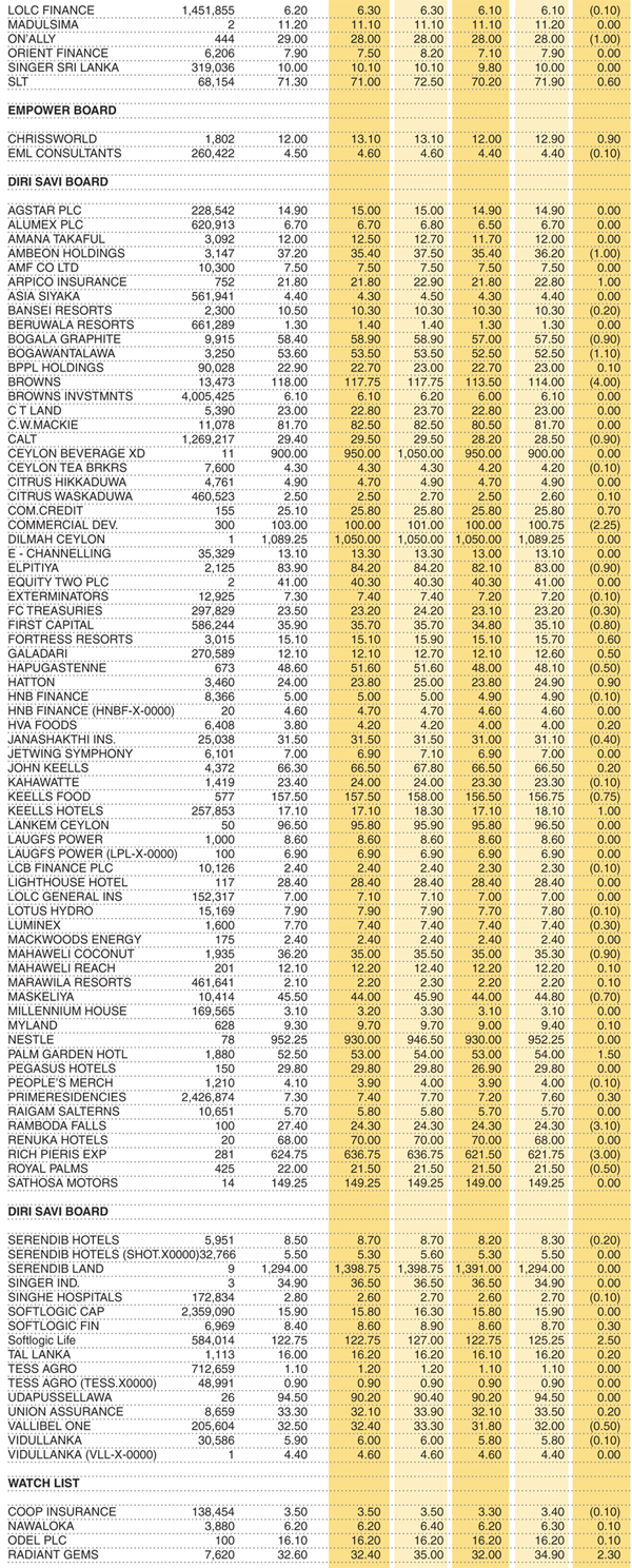 Shares – Colombo Stock Exchange ( Market Statistics on 09.02.2023 ) Business On Feb 9, 2023 Untitled 19 0 0 104 Share Business Tags: Print Edition Shares – Colombo Stock Exchange Friday, February 10, 2023 – 01:00 0 104 Share FacebookTwitterGoogle+ReddItWhatsAppPinterestEmail
