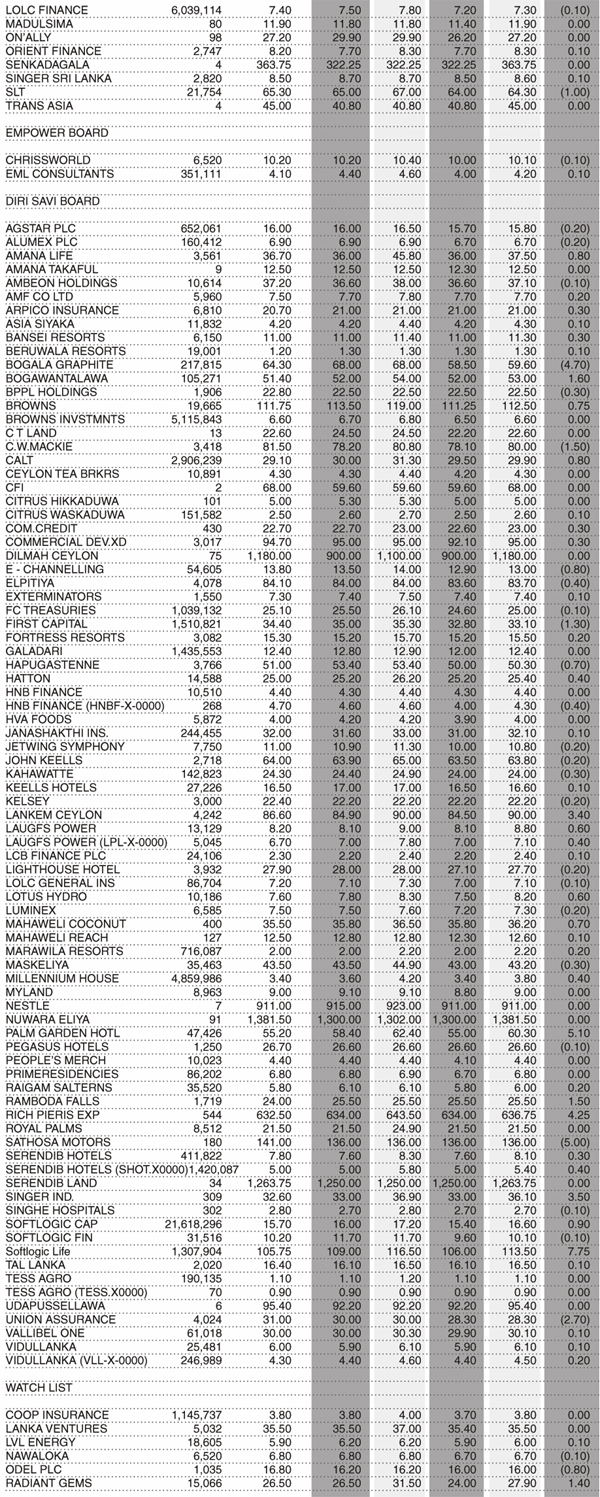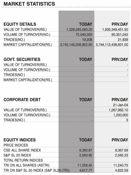 Shares – Colombo Stock Exchange ( Market Statistics on 11.01.2023 ) Business On Jan 11, 2023 Untitled 38 0 70 Share Business Tags: Print Edition Shares – Colombo Stock Exchange Thursday, January 12, 2023 – 01:00 0 70 Share FacebookTwitterGoogle+ReddItWhatsAppPinterestEmail