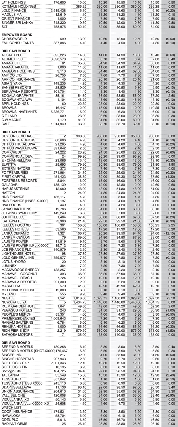 Shares – Colombo Stock Exchange ( Market Statistics on 22.02.2023 ) Business On Feb 22, 2023 Untitled 29 2 0 66 Share Business Tags: Print Edition Shares – Colombo Stock Exchange Thursday, February 23, 2023 – 01:00 0 66 Share FacebookTwitterGoogle+ReddItWhatsAppPinterestEmail