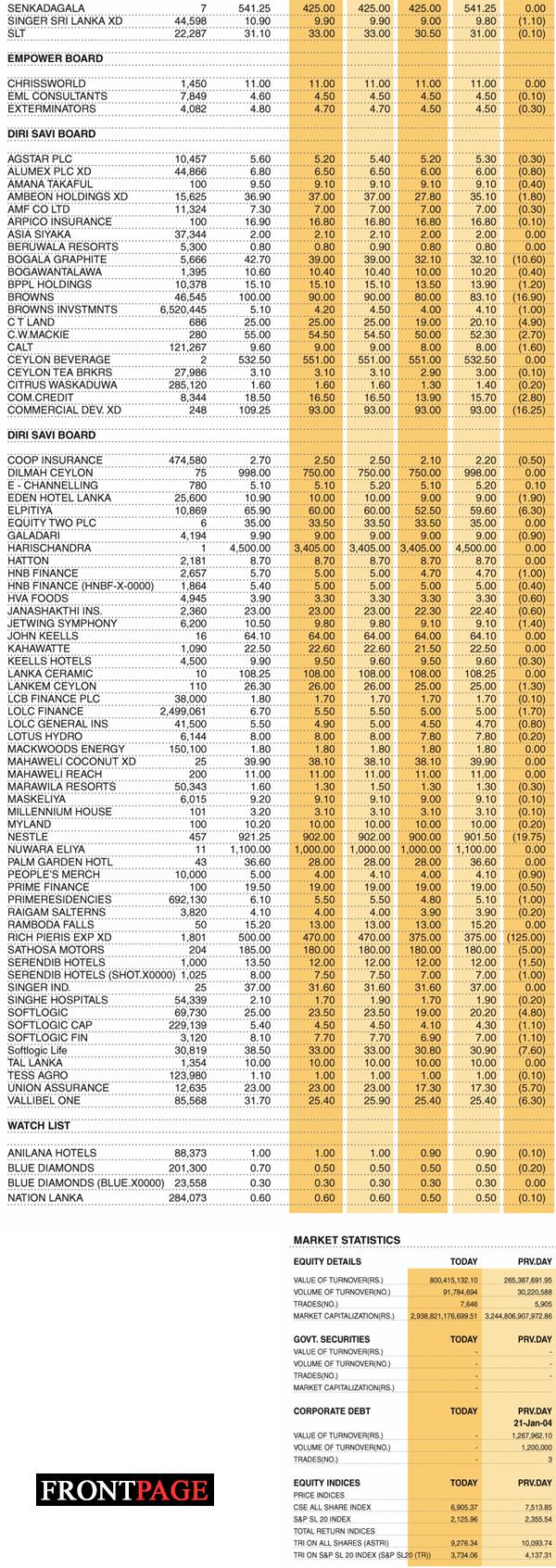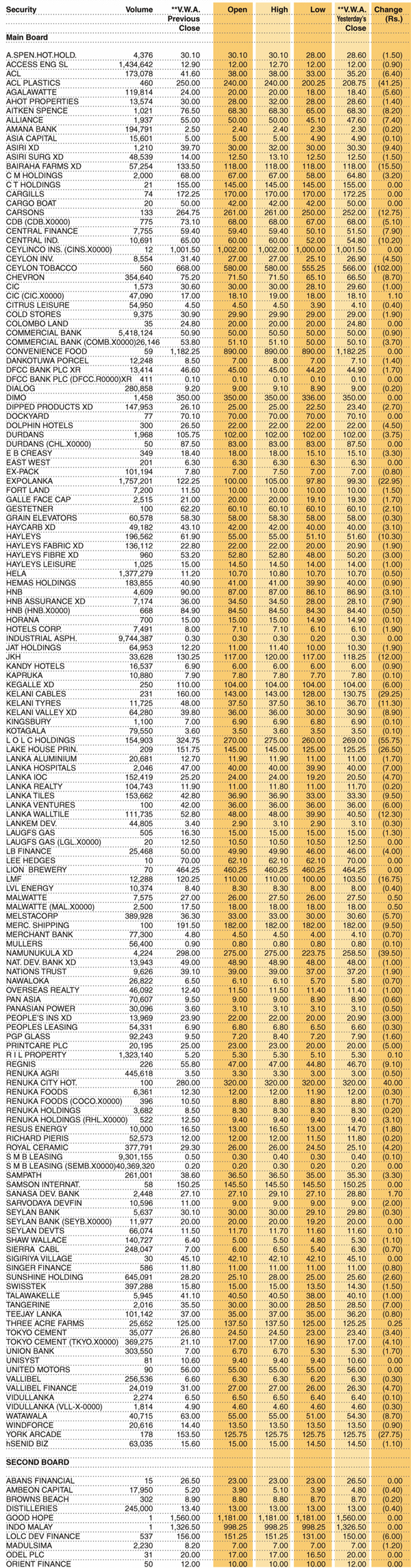Shares – Colombo Stock Exchange ( Market Statistics on 26.04.2022) Business On Apr 26, 2022 0 43 Share Business Tags: Print Edition Shares – Colombo Stock Exchange Wednesday, April 27, 2022 – 01:00 0 43 Share FacebookTwitterGoogle+ReddItWhatsAppPinterestEmail