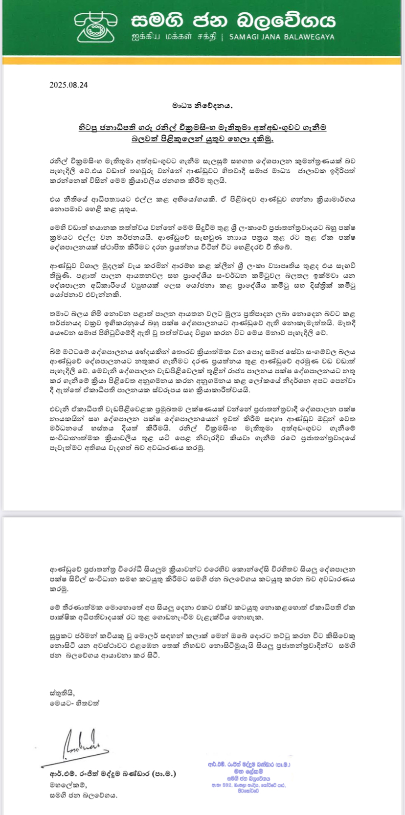 In a press release, the SJB criticized government initiatives such as the Clean Sri Lanka project, regional and district committees, and restrictions on local government funding, arguing these moves undermine multi-party politics. The party also warned that efforts to control public service unions reflect a dictatorial approach.