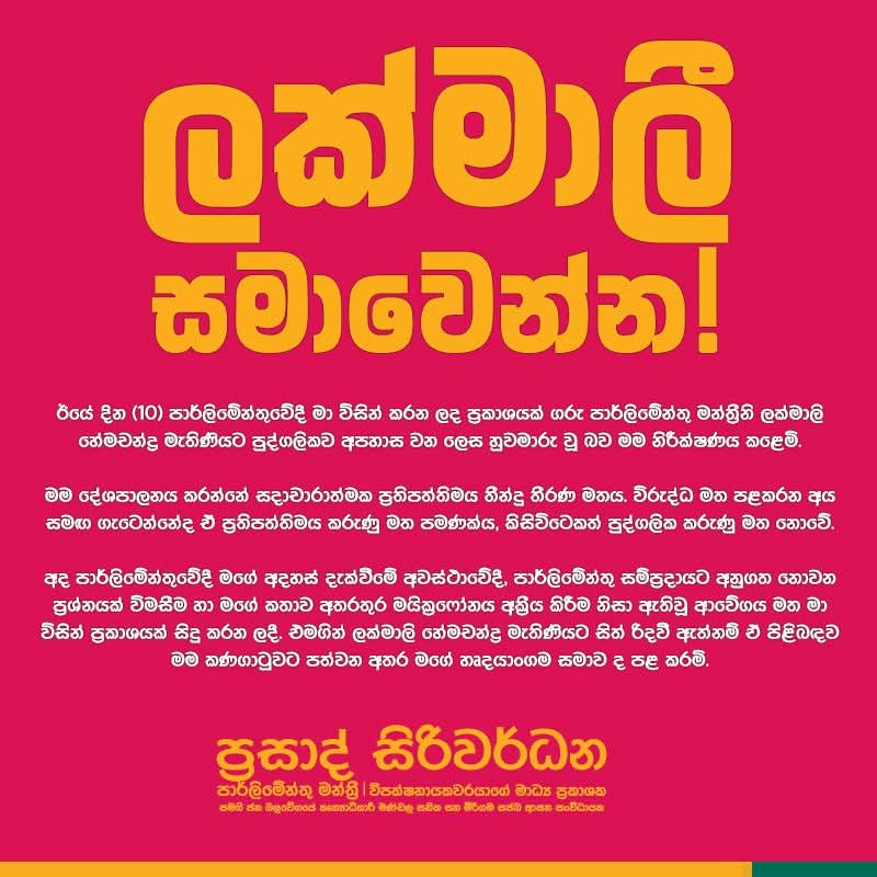 Siriwardena said a comment he made during the debate may have been construed as personally offensive and expressed “heartfelt regret” if Hemachandra was hurt. He stressed that his politics are guided by policy disagreements and not personal attacks.