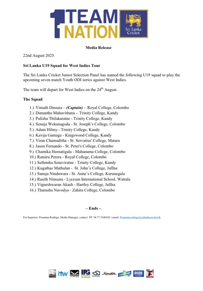 According to the SLC, the team will depart for the West Indies on the 24th August.