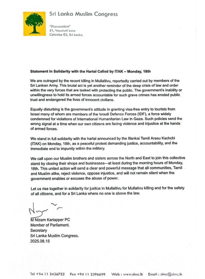 Issuing a statement in support of the hartal, the SLMC said, “We are outraged by the recent killing in Mullaitivu, reportedly carried out by members of the Sri Lankan Army. This brutal act is yet another reminder of the deep crisis of law and order within the very forces that are tasked with protecting the public.”