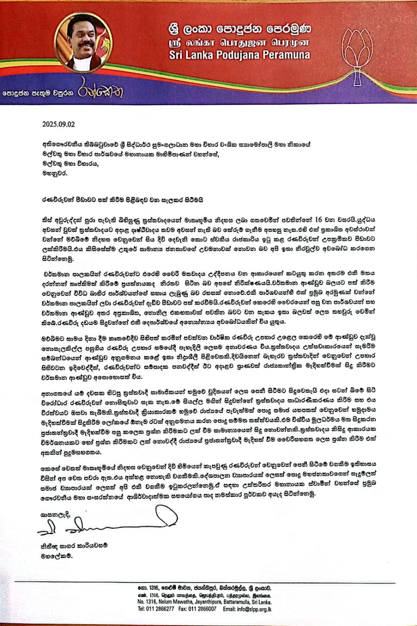 Sri Lanka Podujana Peramuna (SLPP) has written to the Mahanayake Theras of both the Asgiriya and Malwathu Chapters, raising concerns over what it describes as the government’s attempts to oppress war heroes – referring to the military soldiers who fought to end terrorism in Sri Lanka.