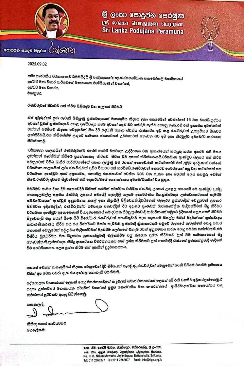 In letters dated September 2 and signed by SLPP General Secretary Attorney-at-Law Sagara Kariyawasam, the party warns that while terrorism ended 16 years ago, the ideology behind it still persists. It accuses the present administration of taking steps that satisfy groups hostile to war heroes, allegedly under pressure from external actors who supported the government’s rise to power.