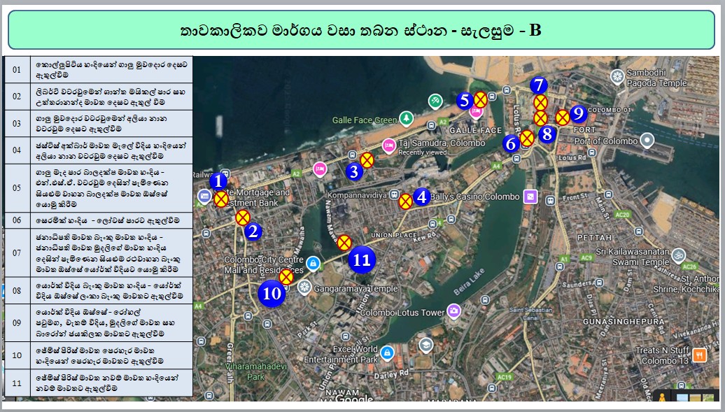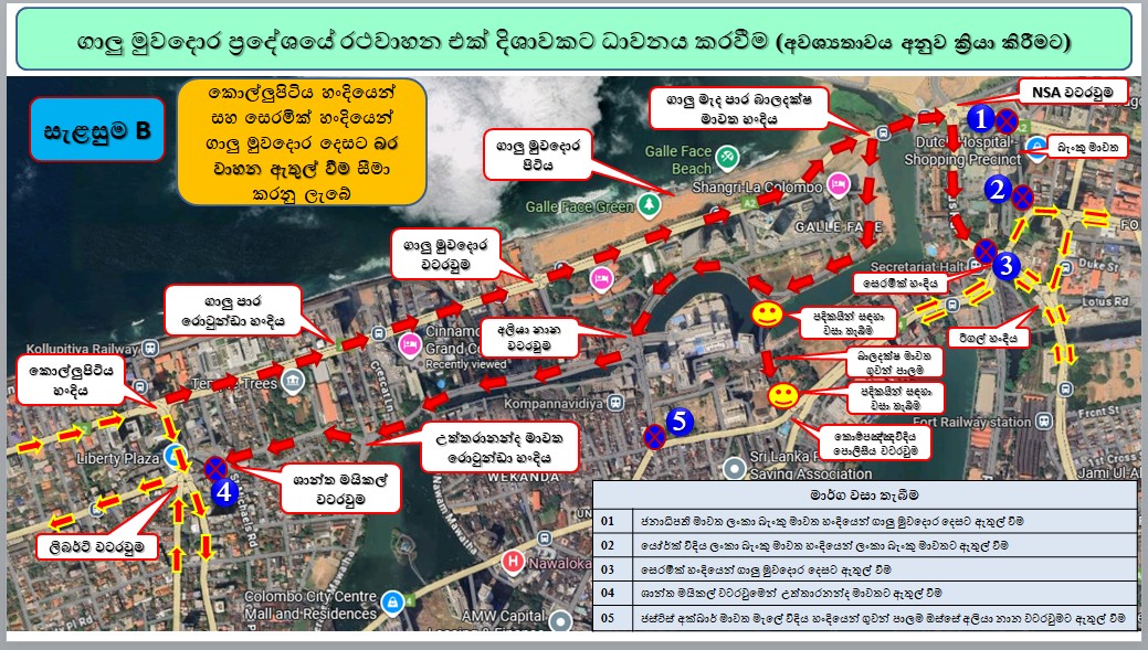 • Vehicles exiting Colombo via Galle Middle Road may be diverted through NSA Roundabout, Galle Face Road, and Baladaksha Mawatha towards Colpetty.
