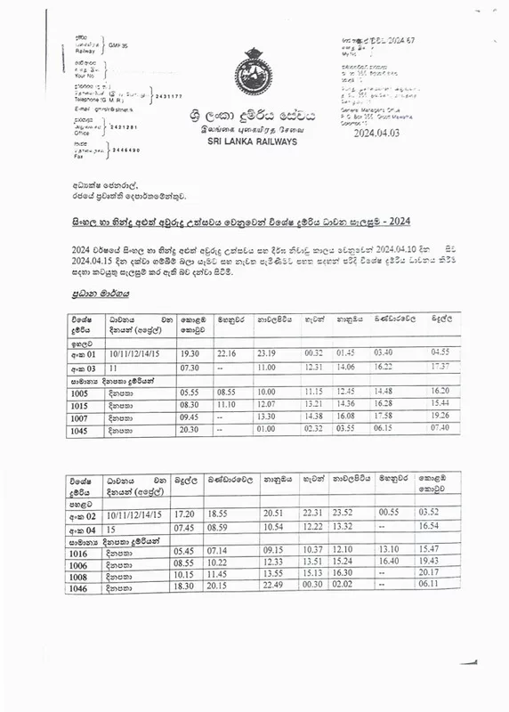 Sri Lanka Railways has announced special train services for the upcoming April New Year festive season.