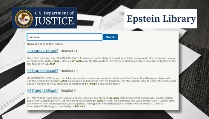 Sri Lanka is mentioned in 188 search results within the publicly released Jeffrey Epstein document archive, according to a review of the Epstein records library updated in the U.S. Department of Justice website.