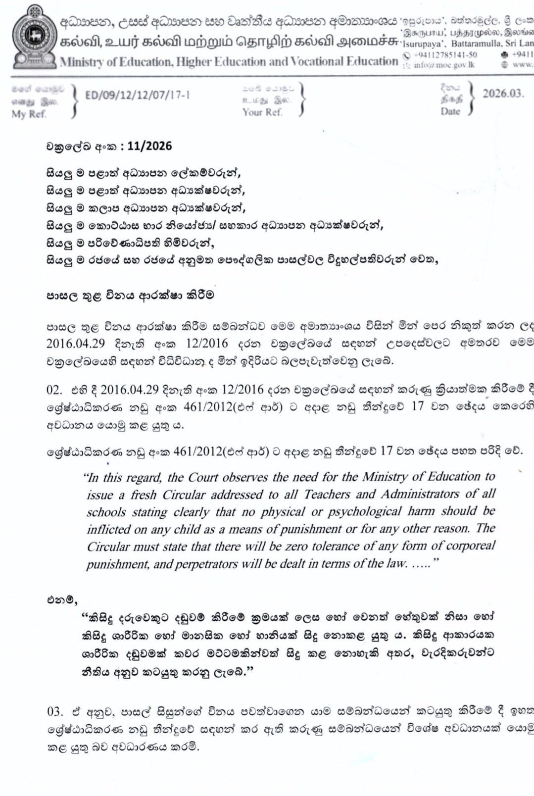 Sri Lanka’s Education Ministry has issued a directive to all schools stating that corporal punishment and any form of physical or psychological harm to students are strictly prohibited.