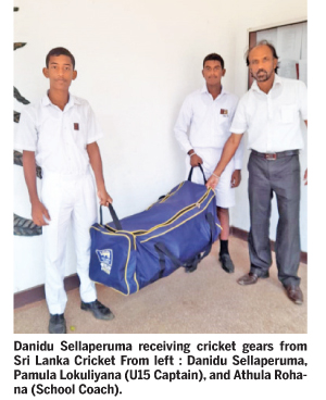 The “cricket equipment,’ was handed over to the player recently in the presence of his school team captain, Pamula Lokuliyana and school coach, Athula Rohana.