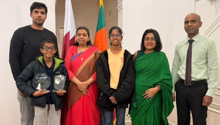 Taavi Samaraweera, 10, of S. Thomas’ College, Mt. Lavinia, and Muthuli Welathanthrige paid a courtesy call on Sri Lanka’s Ambassador to Qatar, Sithara Khan, at the embassy on Jan. 25.