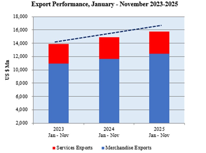 Cumulative total exports, including both merchandise and services, were estimated at US$ 15,776.36 Mn for the period January to November 2025, making a notable 5.8 % growth compared to the same period in 2024.