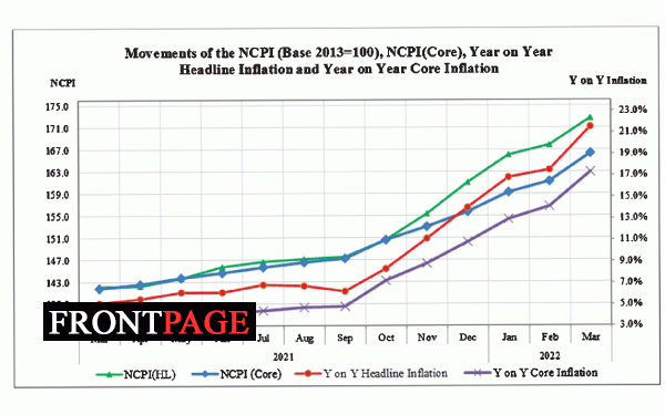 The broad-based National Consumer Price Index (NCPI) rose 21.5% year-on-year in March, more than four times the 5.1 per cent inflation of a year earlier.