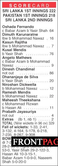 Once again Dinesh Chandimal was the day’s hero scoring unbeaten 86 while leg spinner Mohammad Nawaz was the most successful bowler taking 5 for 88. Leg spinner Yasir Shah made a good supporting role to finish 3 for 122.