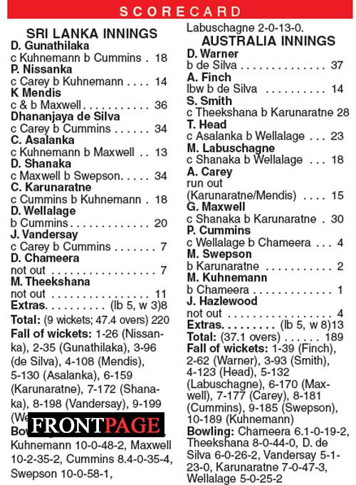 The in-form batter Charith Asalanka did not stay long scoring only 13 in 27 balls while Skipper Dasun Shanaka came to the middle at the most crucial stage producing some good shots but leg spinner Mitchell Swepson who played his third ODI struck to dismiss Shanaka who scored a brisk knock of 34 in 36 balls with 5 fours while 19-year-old Dunith Wellalage who played his first One-Dayer innings yesterday made a valuable 20 runs in 35 balls with a four and a six was finally bowled by Cummins who finished with best figures of 4 35 in his 8.3-over spell.