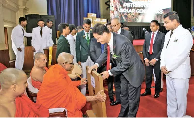 A Buddhist monk receives a solar panel from Chinese Ambassador Qi Zhenhong. Pictures by Rukmal Gamage.