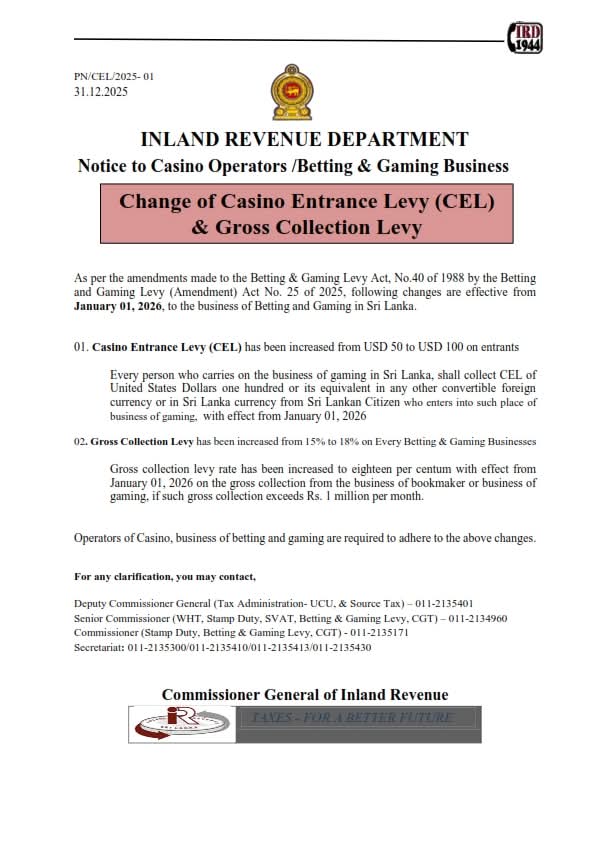 Sri Lanka’s Inland Revenue Department has announced an increase in casino entrance fees and betting and gaming levies, with the revised rates set to take effect from January 1, 2026.