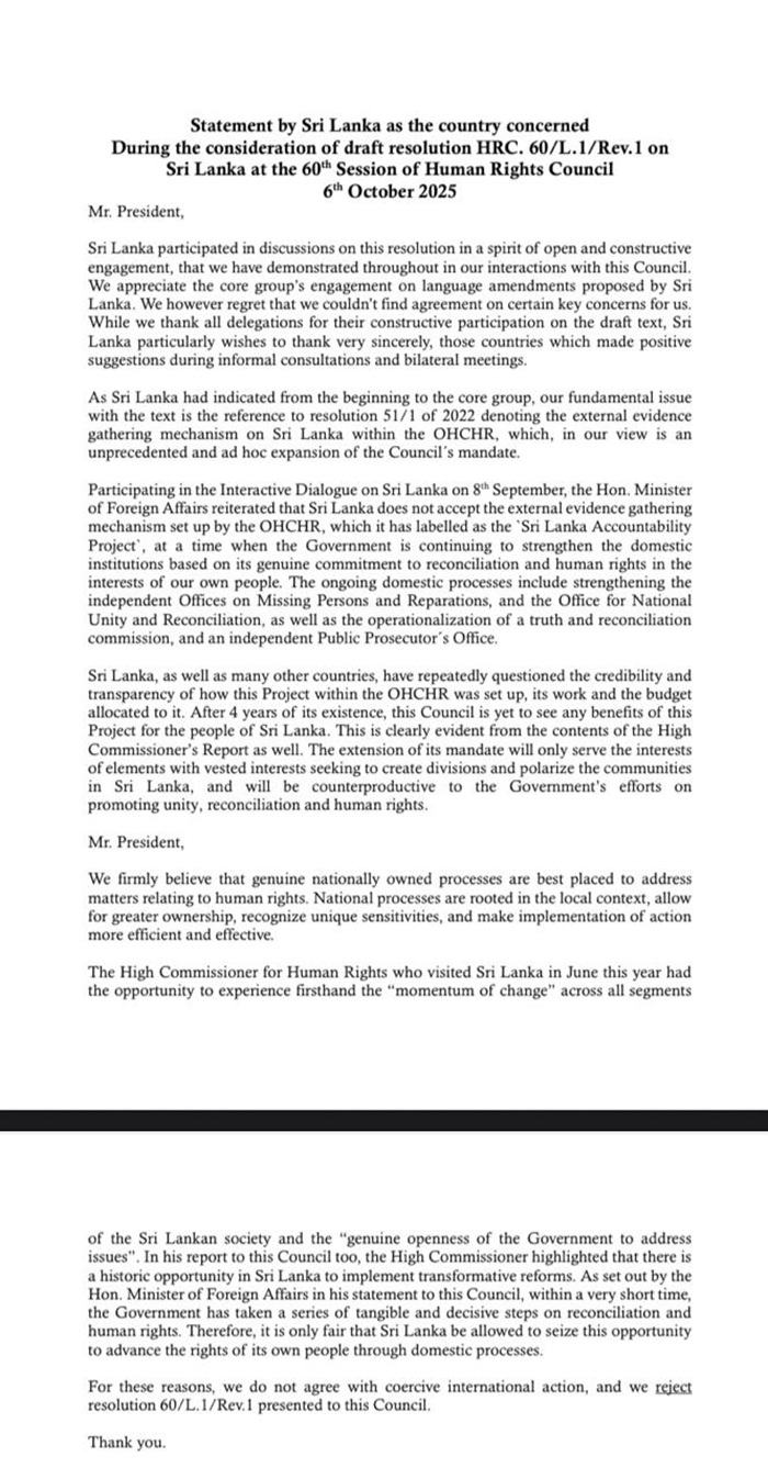 Pointing out that it is only fair that Sri Lanka be allowed to seize this opportunity to advance the rights of its own people through domestic processes, the statement says that for these reasons, Sri Lanka does not agree with coercive international action, and it rejects resolution 60/L.1/Rev.1 presented to this Council.