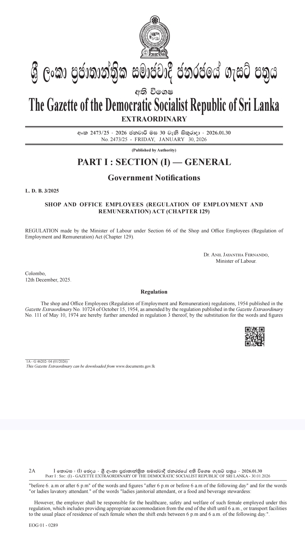 The Extraordinary Gazette, issued on January 30, amends existing regulations under the Shop and Office Employees (Regulation of Employment and Remuneration) Act, expanding the scope for employing female workers during night hours.