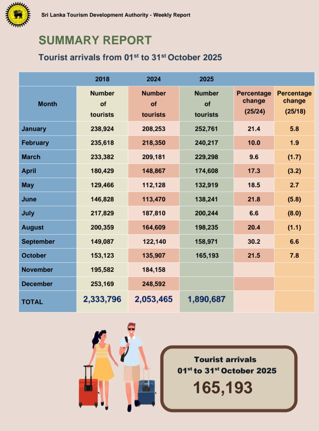 Sri Lanka welcomed 165,193 tourists in October 2025, marking a 21.5% increase compared to the same month last year.