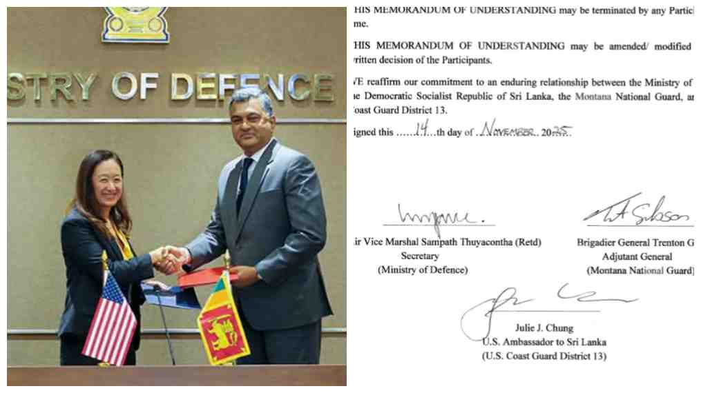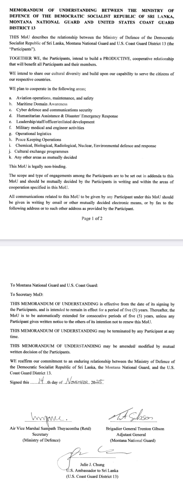 The landmark MOU, signed on November 14, strengthens defence cooperation under the State Partnership Program (SPP) between Sri Lanka’s Armed Forces and the Montana National Guard, along with the U.S. Coast Guard District 13.