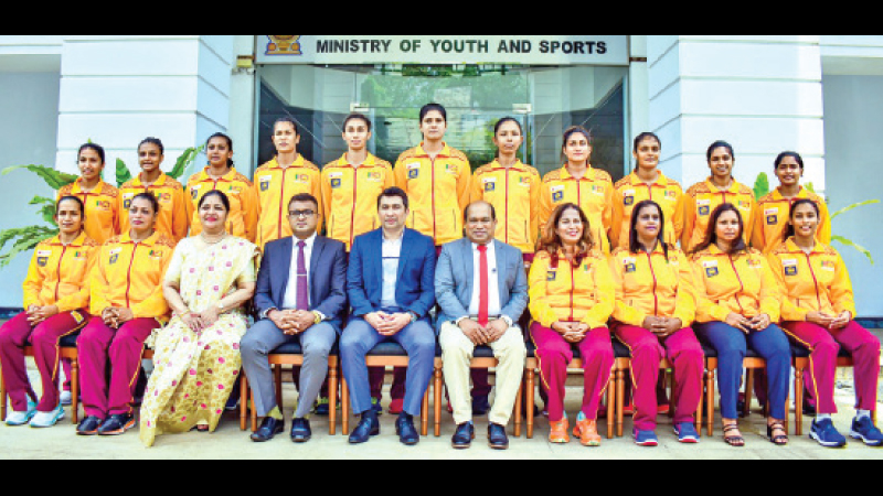The 12 member Sri Lanka Netball team which will take part in the forthcoming Asian Netball championship in Singapore poses for a picture with Sports Minister Roshan Ranasinghe ,Sports Ministry Secretary Dr Amal Harsha de Silva Netball President Victoria Lakshmi and Sports Director General Amal Edirisooriya on Monday before their departure for Singapore.The team is led by Gayanjali Amarawansa while Dulangi Wannithilleka is the deputy skipper of the team. ( Pix courtesy Sport Ministry)