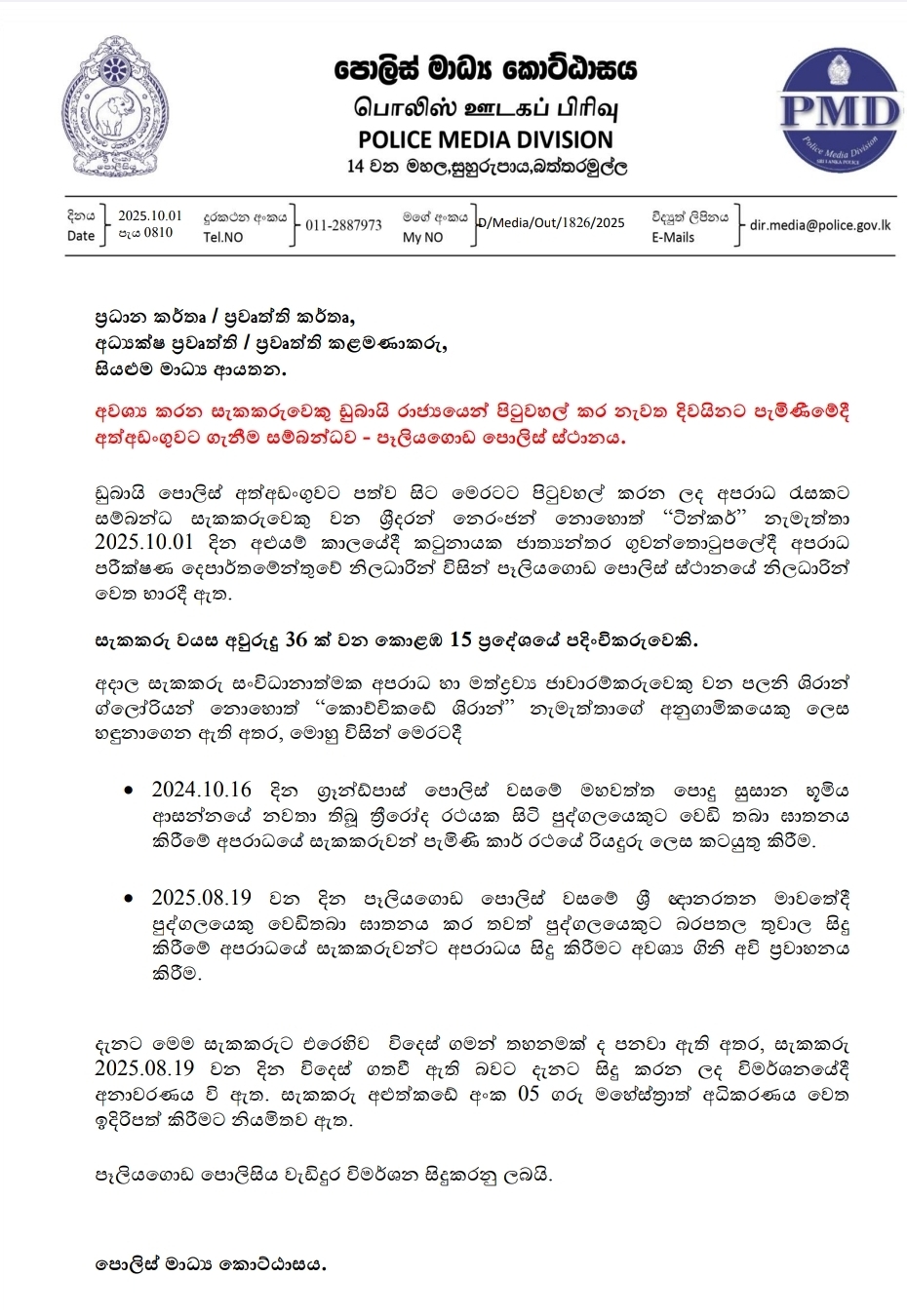 Sri Lankan national Sridharan Niranjan, also known as ‘Tinker’, who was deported from Dubai, was brought to the island this morning (Oct. 1) and handed over to local authorities.