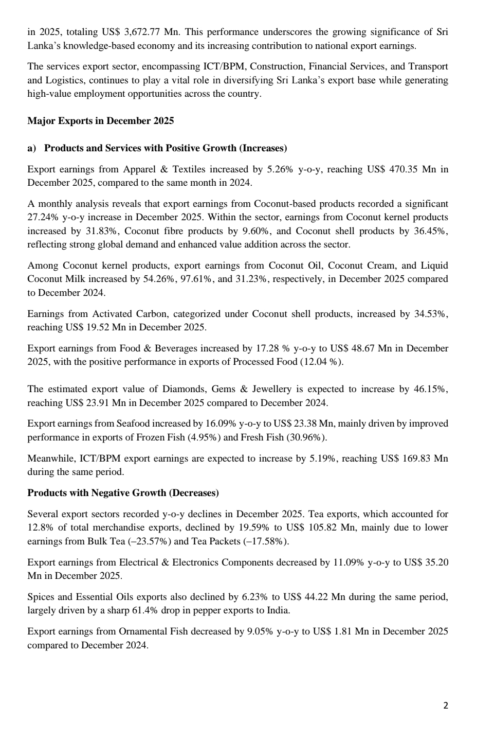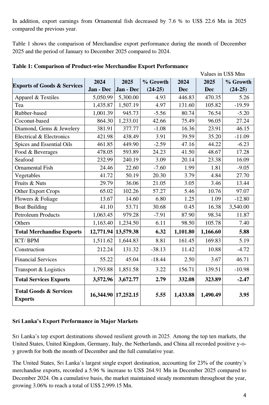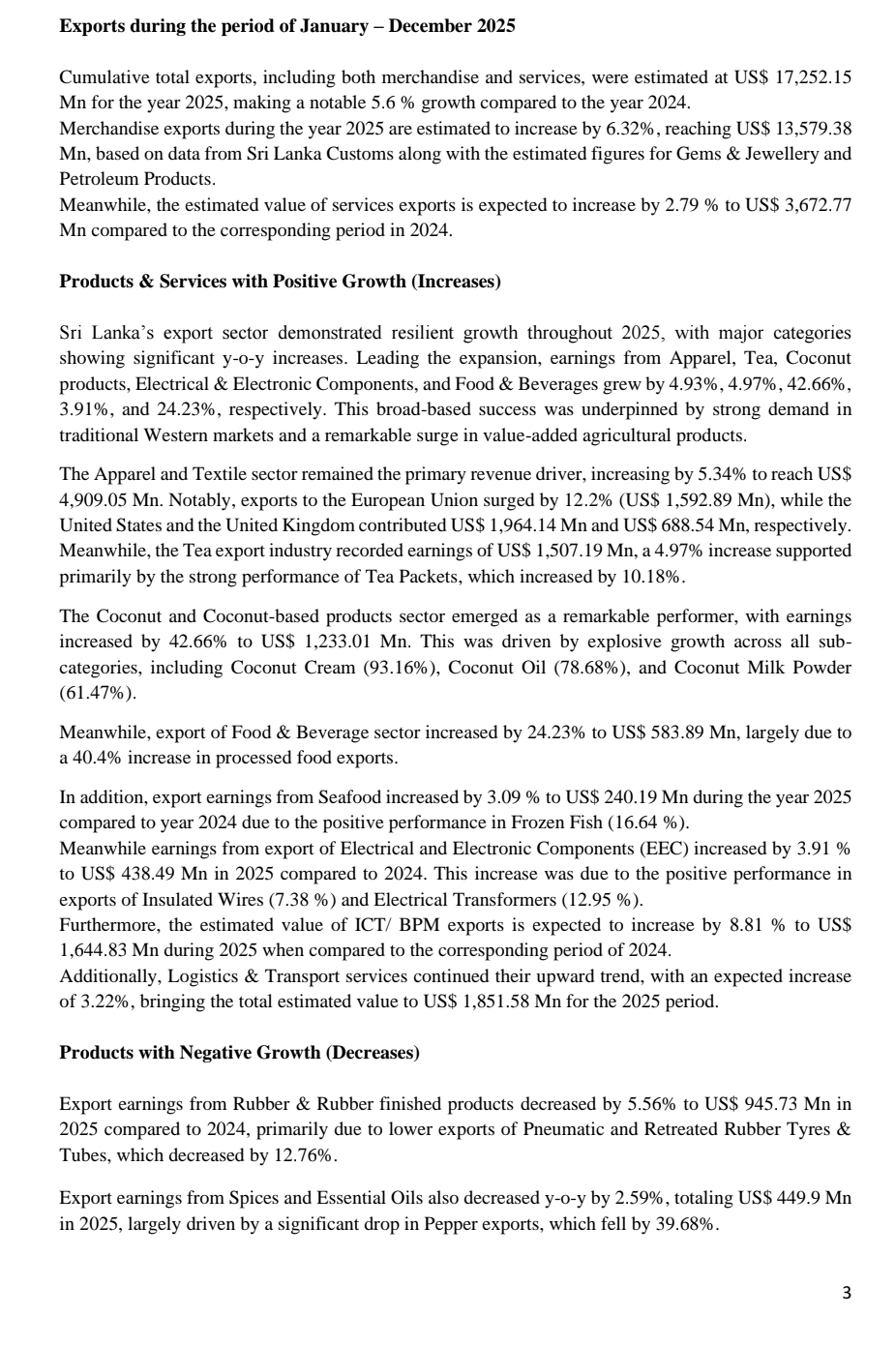 The post Sri Lanka’s Export Performance Exceeded US$ 17.2 Billion in 2025 appeared first on Newswire.