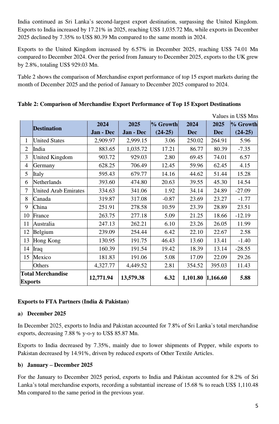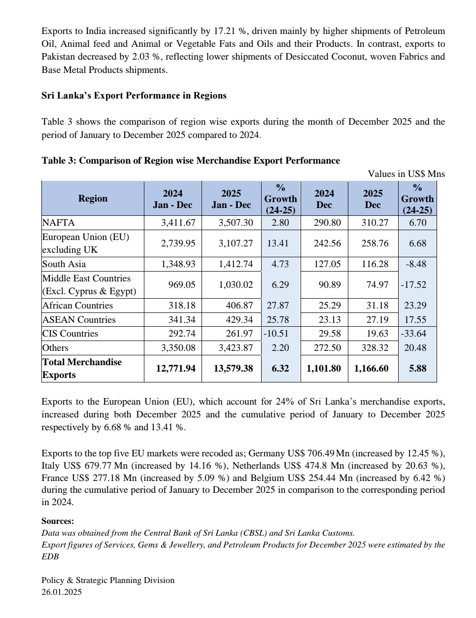 In December 2025, merchandise exports recorded a 5.88 % y-o-y increase, reaching US$1,166.60 Mn, according to provisional data of Sri Lanka Customs, including estimated figures for Gems and Jewellery and Petroleum Products. For the full year 2025, merchandise export earnings amounted to US$13,579.38 Mn, reflecting a 6.32 % increase compared to 2024.