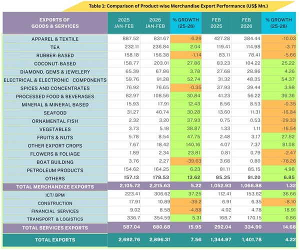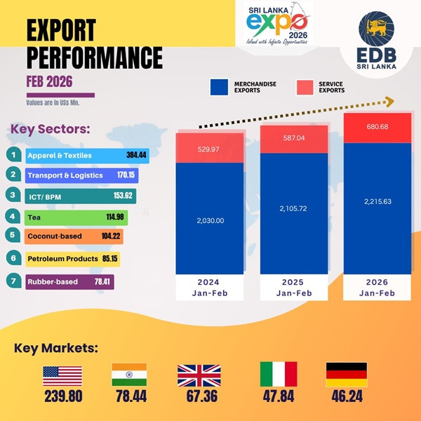 The Export Development Board (EDB) says Sri Lanka’s total exports, including both merchandise and services, reached US$ 1,401.78 million in February 2026, reflecting a notable year-on-year growth of 4.22% compared to February 2025.