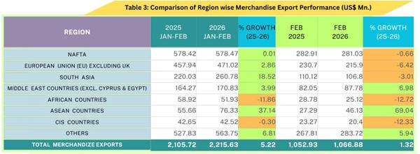 Table 3 shows the comparison of region wise exports for February 2025–2026, along with the cumulative figures for the January–February period.