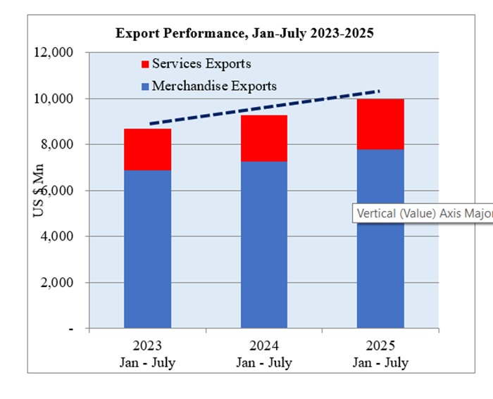 Cumulative total exports, including both merchandise and services, were estimated at US$ 9,992.53 Mn for the period January to July 2025, making a notable 7.79 % growth compared to the same period in 2024.