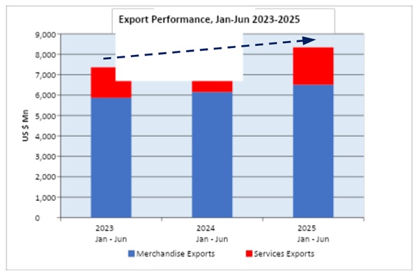 Cumulative total exports, including both merchandise and services, were estimated at US$ 8,337.86 Mn for the period January to June 2025, making a notable 6.70 % growth compared to the same period in 2024.