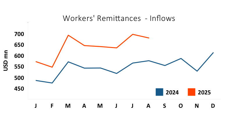 In August 2025, remittances totaled US$680.8 million, up 19.3% from US$577.5 million in August 2024.
