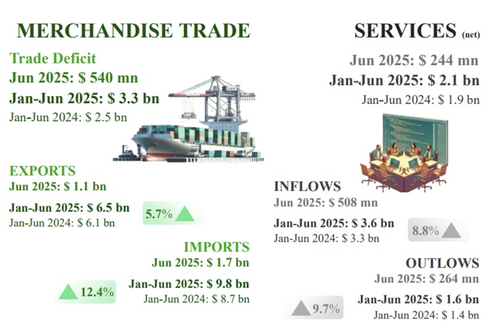 Total exports, including merchandise goods and services, amounted to US dollars 10.1 billion in the first half of 2025, recording a y-o-y growth of 6.8 per cent.