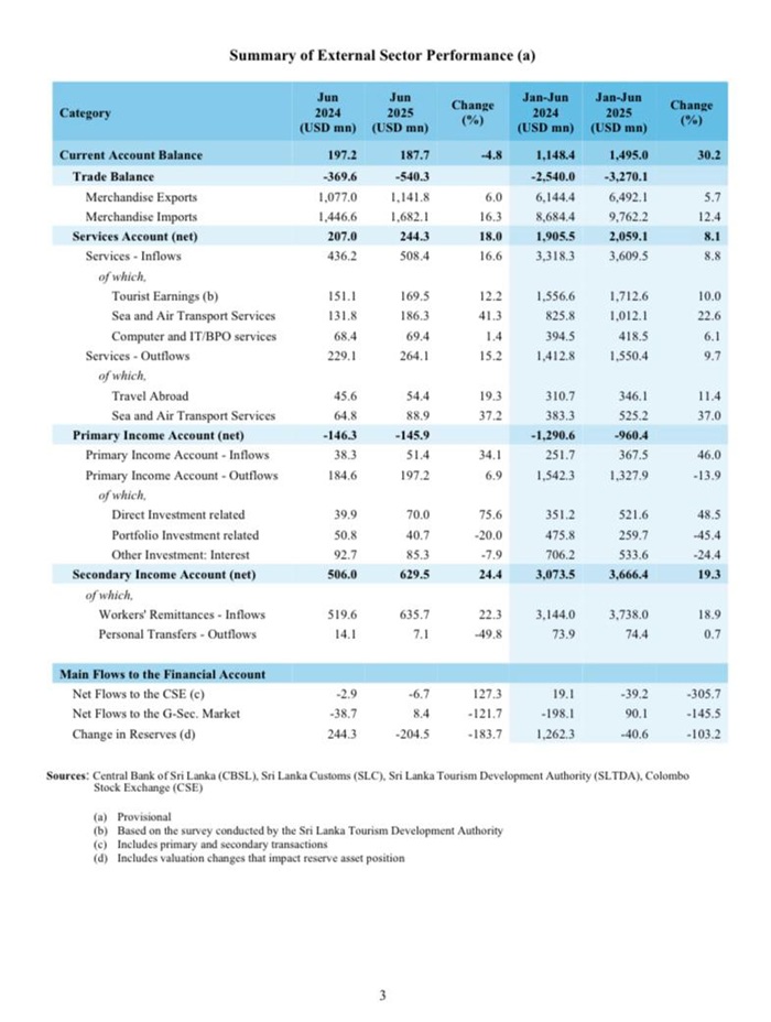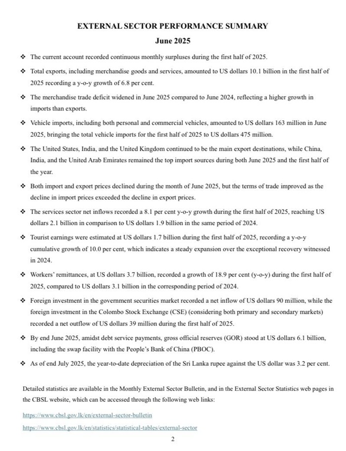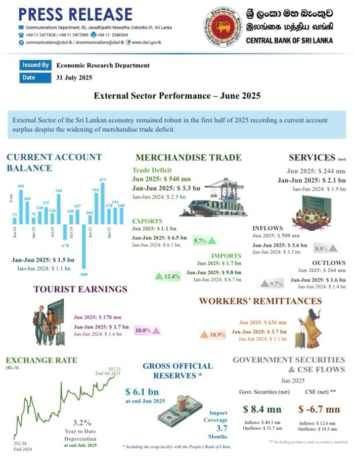 The Central Bank of Sri Lanka (CBSL) says the external sector of the Sri Lankan economy remained robust in the first half of 2025, recording a current account surplus despite the widening of the merchandise trade deficit.
