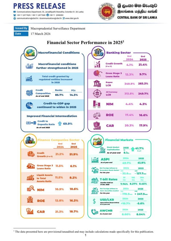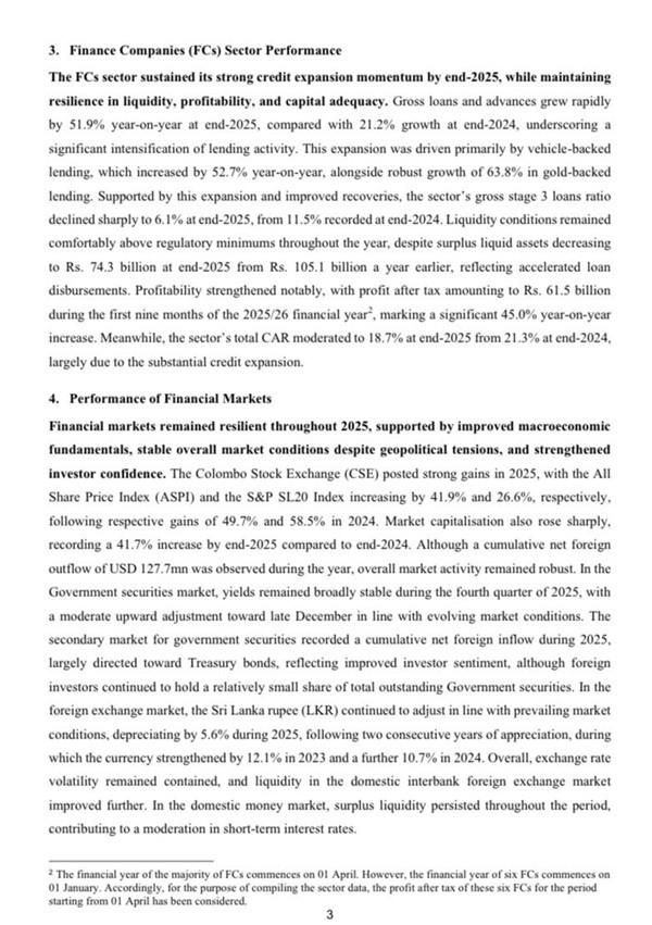 Financial markets remained resilient in 2025, supported by stronger fundamentals and investor confidence. The Colombo Stock Exchange posted gains, with the All Share Price Index rising 41.9% and the S&P SL20 up 26.6%. Market capitalisation increased by 41.7% compared to 2024. Government securities yields remained broadly stable, while foreign inflows into Treasury bonds reflected improved sentiment. The Sri Lankan rupee depreciated by 5.6% in 2025 after two years of appreciation, though exchange rate volatility was contained and interbank forex liquidity improved. Surplus liquidity in the domestic money market contributed to moderating short‑term interest rates. (Newswire)
