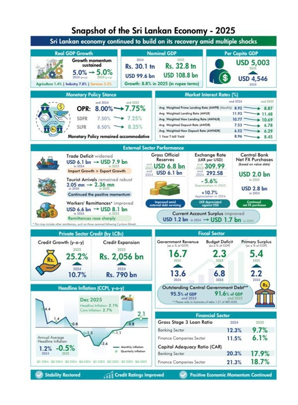 Sri Lanka’s economy recorded strong growth in 2025, with GDP per capita rising to USD 5,003 compared to USD 4,546 in 2024, according to the Central Bank of Sri Lanka (CBSL).